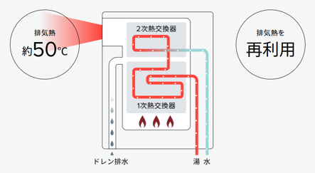 エコジョーズは排気熱を利用して効率よくお湯を沸かします。だからガスの使用量と排気熱を大幅カット!環境にやさしいガス給湯器です。